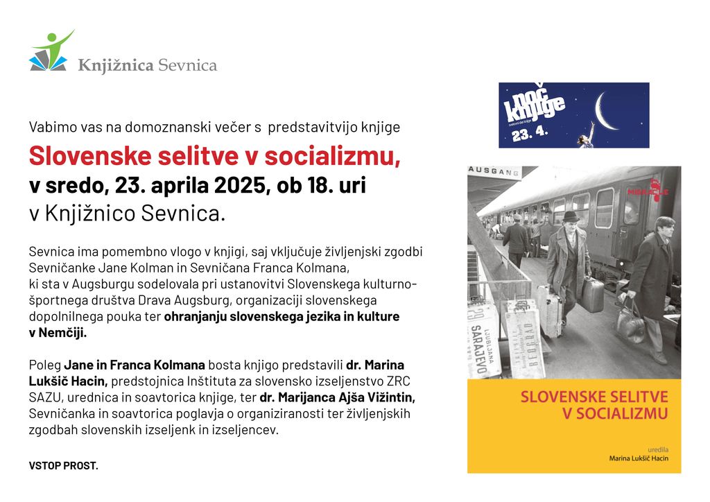 Vabimo vas na domoznanski večer s predstavitvijo knjige Slovenske selitve v socializmu v sredo, 23. aprila 2025, ob 18. uri v Knjižnico Sevnica.