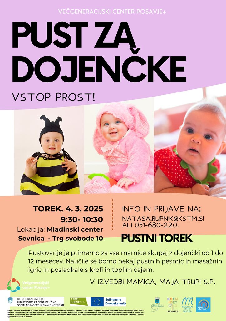 Vabljene na druženje za mamice s pustovanjem za dojenčke v Večgeneracijski center Posavje+, enota Sevnica. Srečanja so primerna za vse mamice skupaj z dojenčki. Vstop je prost.