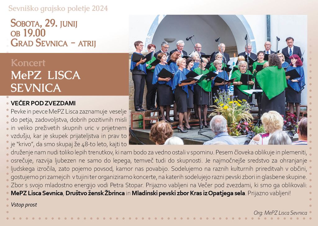 Prijazno vabljeni na Večer pod zvezdami, ki smo ga oblikovali: MePz Lisca Sevnica, Društvo žensk Žbrinca in Mladinski pevski zbor Kras iz Opatjega sela.