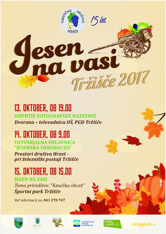 Turistično društvo Tržišče v okviru prireditev Jesen na vasi vabi na osrednjo prireditev, ki bo v nedeljo 15. oktobra ob 15. uri v Športnem parku v Tržišču. Glavna točka prireditve bo kmečka ohcet v izvedbi folklorne skupine Anton Tanc iz Laškega.