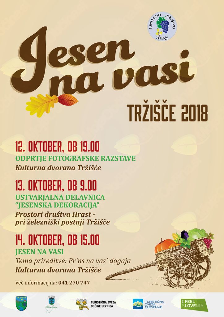 Turistično društvo Tržišče organizira že tradicionalno prireditev Jesen na vasi. Osrednja prireditev bo v nedeljo, 14. oktobra s pričetkom ob 15.uri v Kulturni dvorani Tržišče ali v Športnem parku v Tržišču, odvisno od vremena.