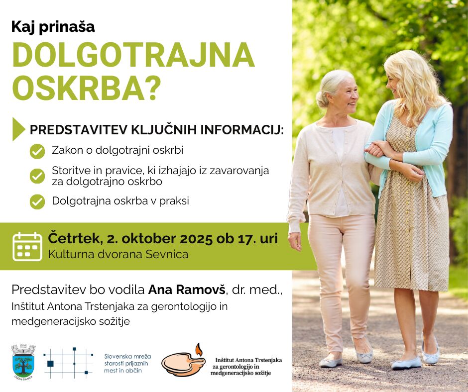 Občina Sevnica v sodelovanju z Inštitutom Antona Trstenjaka za gerontologijo in medgeneracijsko sožitje pripravlja brezplačen dogodek, namenjen predstavitvi najpomembnejših informacij o dolgotrajni oskrbi.