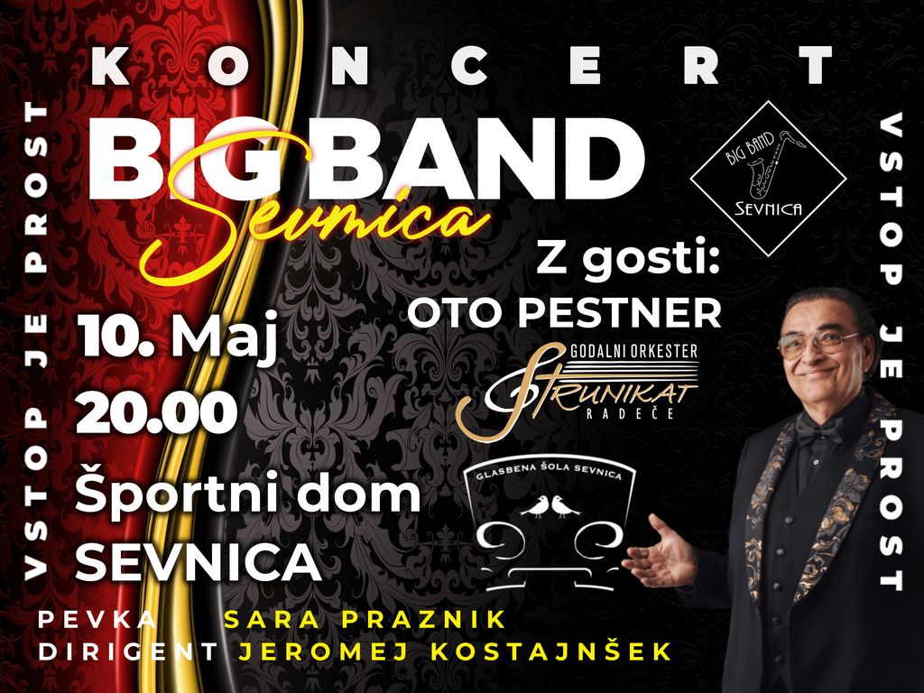 Big Band Sevnica vabi na svoj letni koncert, 10. maja ob 20.00 v Športnem domu Sevnica. Tokrat bomo sodelovali še z združenim godalnim orkestrom KD Godalni orkester Strunikat in Glasbena šola Sevnica. V goste pa smo povabili ikono slovenske popevke - Ota Pestnerja! Vljudno vabljeni, vstop je prost!