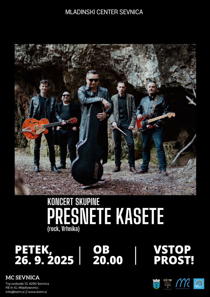 PRESNETE KASETE so pet članska rock skupina iz Vrhnike, ki jo sestavljajo: Zvezdan Velić (vokal), Peter Voljč (kitara in spremljevalni vokal), Tomaž Berginc (kitara in spremljevalni vokal), Gregor Dovjak (bas kitara in spremljevalni vokal) ter Luka Krže (bobni in perkusija).