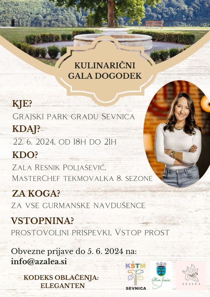Vabljeni na Kulinarični gala dogodek v grajskem parku na Gradu Sevnica, 22. 6. 2024 od 18h do 21h, kjer vam bo Zala Resnik Poljašević, tekmovalka 8. sezone MasterChefa, predstavila in pričarala edinstven večer, prežet s kulinariko. Dogodek bodo zajemali trije deli: v prvem delu bo predstavljena njena izkušnja s tekmovanjem in kulinarična kariera, sledila bo pogostitev z glasbeno spremljavo, na koncu pa bo še drugi del dogodka zajemal pogovor in oris praktičnih uporabnih nasvetov in trikov, kako lahko vsak posameznik nadgradi svoje kuhanje v domači kuhinji in jedi postavi na višji nivo.