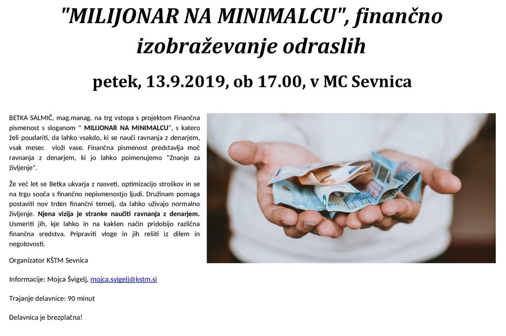 BETKA SALMIČ, mag.manag. na trg vstopa s projektom Finančna pismenost s sloganom " MILIJONAR NA MINIMALCU", s katero želi poudariti, da lahko vsakdo, ki se nauči ravnanja z denarjem, vsak mesec vloži vase. Finančna pismenost predstavlja moč ravnanja z denarjem, ki jo lahko poimenujemo "Znanje za življenje".
