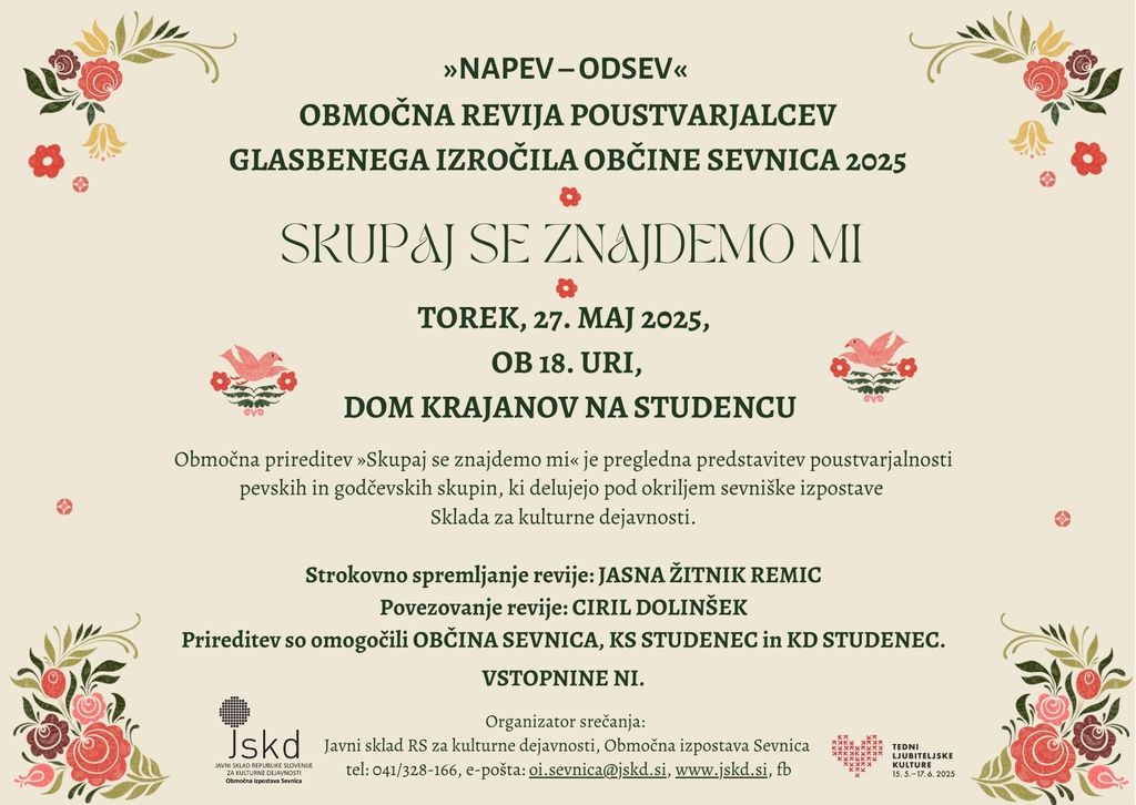 Vabljeni na Napev - odsev 2025, revijo poustvarjalcev glasbenega izročila občine Sevnica (srečanje pevcev ljudskih pesmi in godcev ljudskih viž občine Sevnica), kjer se bodo predstavile skupine in godci, ki delujejo v občini Sevnica.