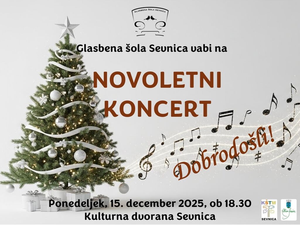 Glasbena šola Sevnica vljudno vabi na tradicionalni Novoletni koncert v ponedeljek, 15. decembra 2025, ob 18.30 v Kulturno dvorano Sevnica.