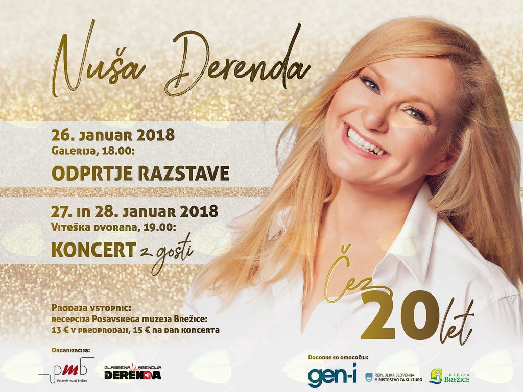 Vse se bo začelo v njenem ljubem kraju, kjer je gospa Alenka Černelič Krošelj, V.D. direktorice iz Posavskega muzeja Brežice naravnost navdušena, da bo 26. januarja pri njih odprtje velike razstave Nuše Derenda, kjer bodo na 60 kvadratih na ogled vidnejše obleke naše pevke in so zaznamovale njeno glasbeno pot in njene največje dosežke, med katerimi je tudi Eurosong. Kreatorji teh oblek so Alenka Globocnik-Akultura, Urša Drofenik, Jelena Prokivić v sodelovanju z IUV in seveda vse pod budnim očesom stilista Sasa Radovića. Prav tako pa bodo v drugem prostoru gradu na ogled Nušini osebni predmeti in slike, zato ne gre za zamuditi te razstave. »V Viteški dvorani gradu sem se tudi poročila s Frenkom«, je zaupala Nuša, ki se odprtja razstave emotivno veseli, dan kasneje pa bo tam tudi koncert in sicer 27. januarja ter tudi 28. januarja, ki hkrati slavnostno odpira popotovanje njenega projekta ob 20 obletnici delovanja. 17. marca bodo na račun prišli vsi ljubitelji posebnih koncertov, saj pripravlja Nuša nekaj malo drugačnega v Galussovi dvorani Cankarjevega doma skupaj s Simfoničnim orkestrom RTV Slovenija.