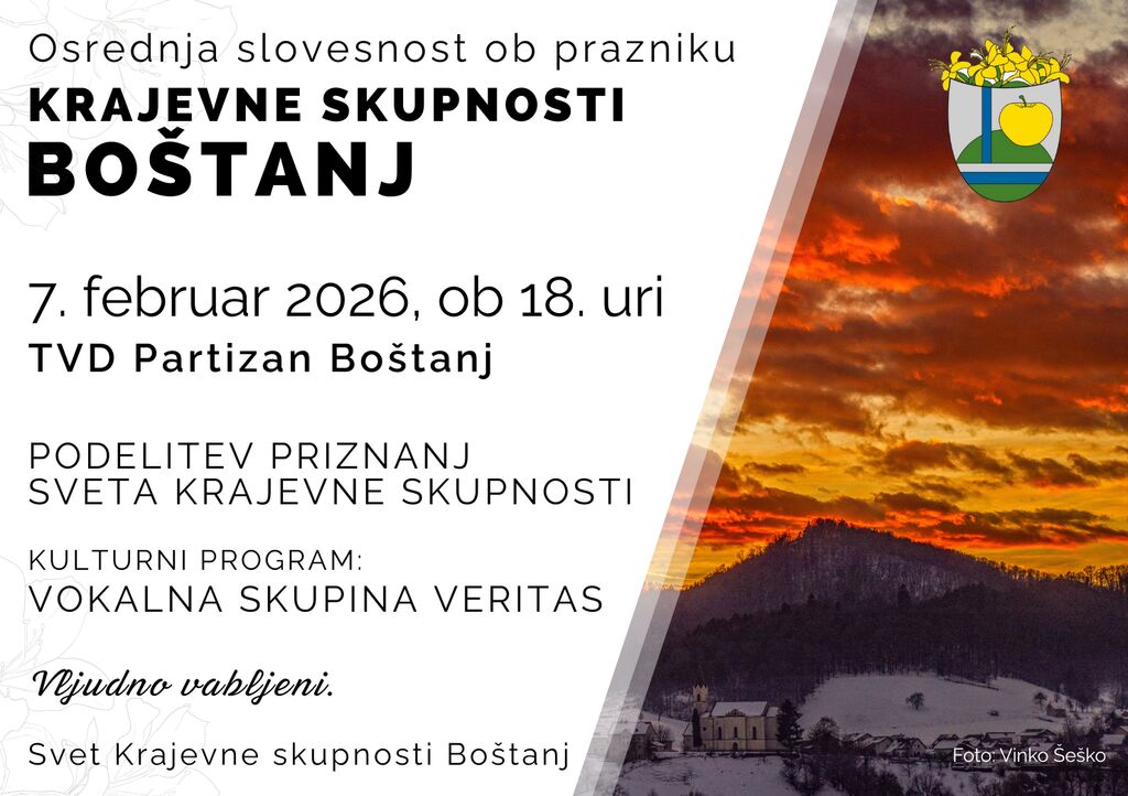 Osrednja slovesnost ob prazniku Krajevne skupnosti Boštanj bo potekala v soboto, 7. februarja 2026, ob 18. uri v TVD Parizan Boštanj.