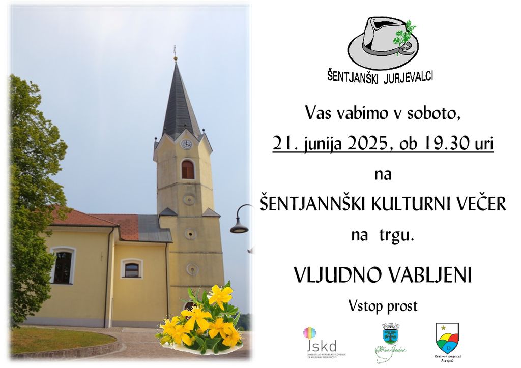 "Šentjanški kulturni večer", ki bo na predvečer farnega žegnanja, v soboto, 21. junija 2025, ob 19.30, na šentjanškem trgu.