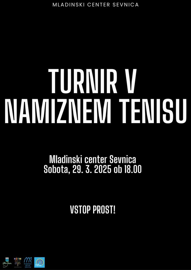 Vabljeni na turnir v namiznem tenisu v Mladinski center Sevnica. Dovoljen je vnos lastne pijače. Vstop je prost.