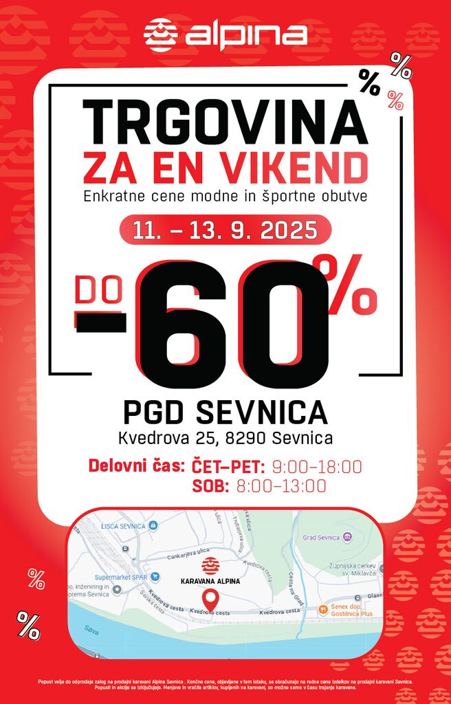 V PGD Sevnici bo od četrtka, 11. septembra do sobote, 13. septembra 2025, potekala velika odprodaja Alpinine obutve po znižanih cenah – popusti segajo vse do 60%!