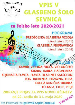 Prijava za vpis je mogoča do 31. maja 2020 preko spletne prijavnice, ki je odprta na spletni strani Glasbene šole Sevnica, kjer so tudi ostale informacije v zvezi z vpisom in šolanjem na glasbeni šoli.