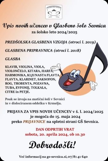 Obveščamo vas, da že zbiramo prijave za vpis novih učencev v Glasbeno šolo Sevnica za šolsko leto 2024/2025.