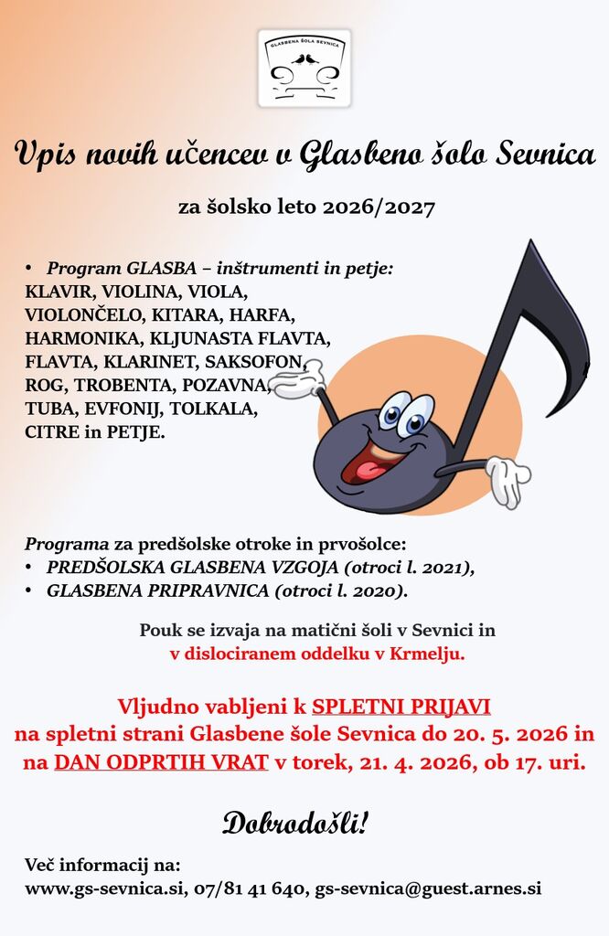 Obveščamo vas, da že zbiramo prijave za vpis novih učencev v Glasbeno šolo Sevnica za šolsko leto 2026/2027.