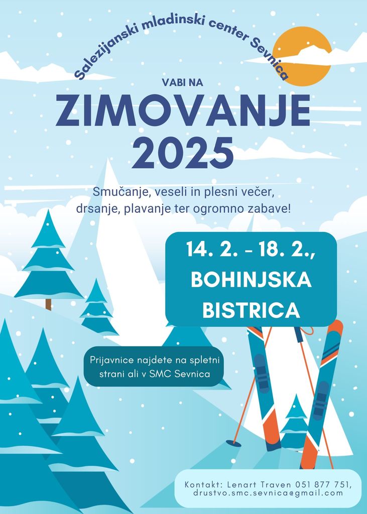 Salezijanski mladinski center Sevnica vabi otroke in mlade na ZIMOVANJE 2025! Skupaj bomo smučali na Voglu, drsali, plavali, imeli veseli in plesni večer ter se imeli super! Prijavnice in dodatne informacije najdete na naši spletni strani in v SMC Sevnica. Hitro se prijavite in povabite še prijatelje!