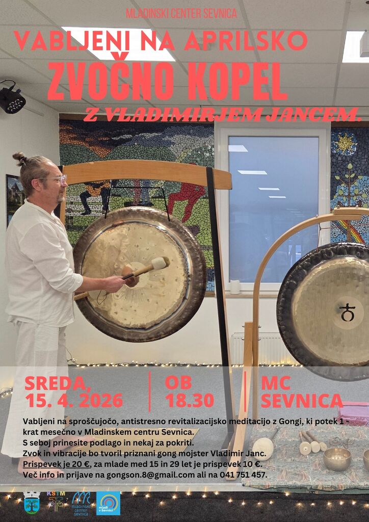 Vabljeni na zvočno kopel z Vladimirjem Jancem v Mladinski center Sevnica, kjer se boste lahko sprostili po napornem dnevu in razbremenili notranjih napetosti. Prispevek znaša 20 €, za mlade med 15 in 29 let je prispevek 10 €.