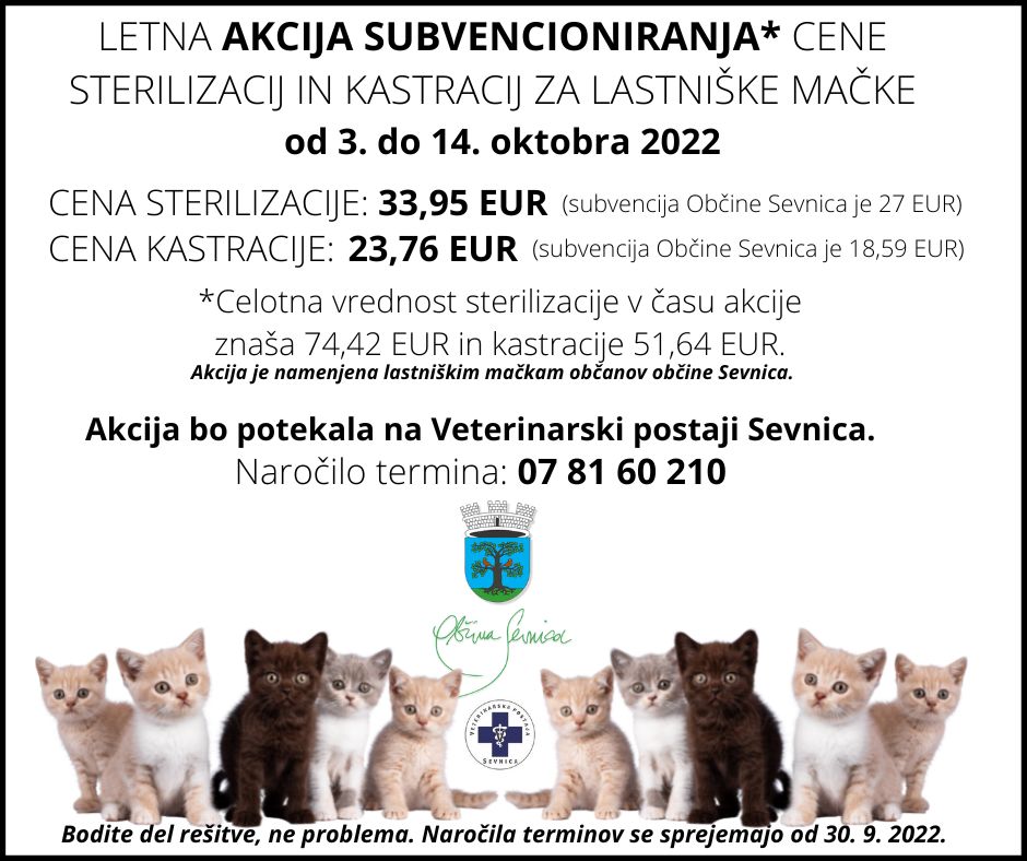 Celotna vrednost sterilizacije v času akcije znaša 74,42 € in kastracije 51,64 €. Akcija je namenjena občanom občine Sevnica.
