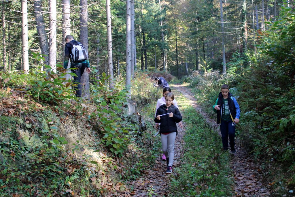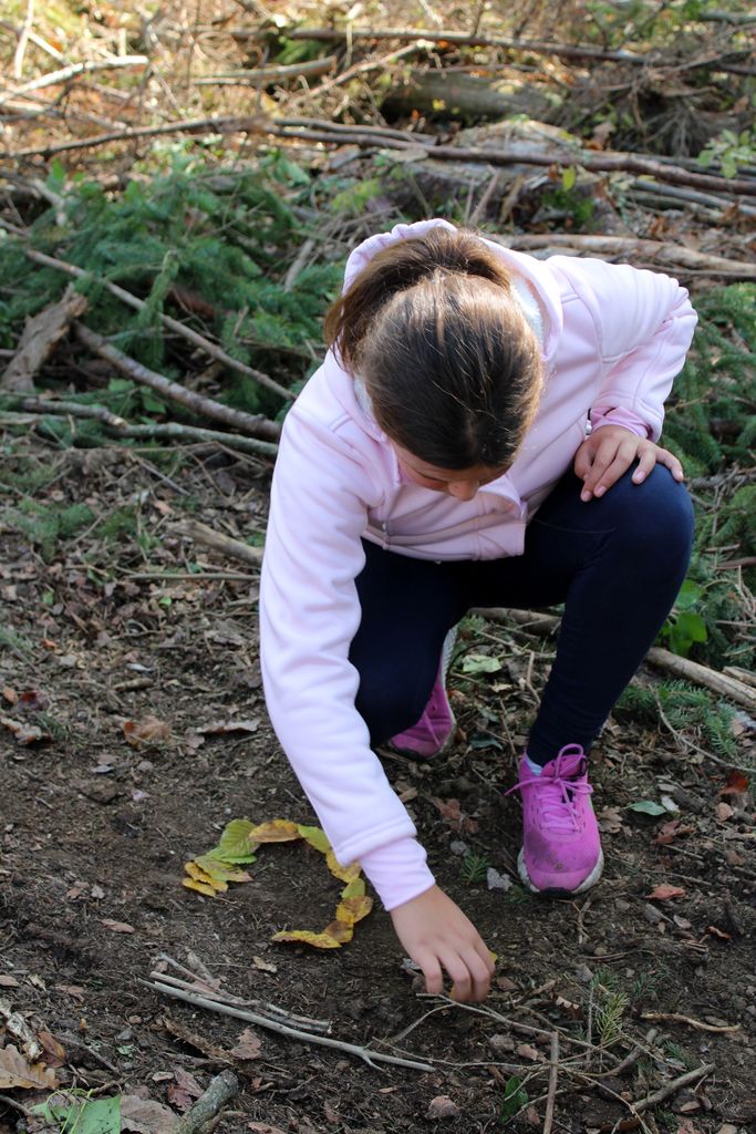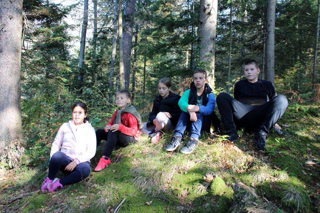 Megleno dopoldne se je med snemalnimi aktivnostmi prevesilo v sončen dan, ki smo ga zaključili z likovno umetnostjo v gozdu. Jelenček nam je bil tako všeč, da smo ga prinesli pred šolo, kjer ga lahko opazujete tudi ostali.