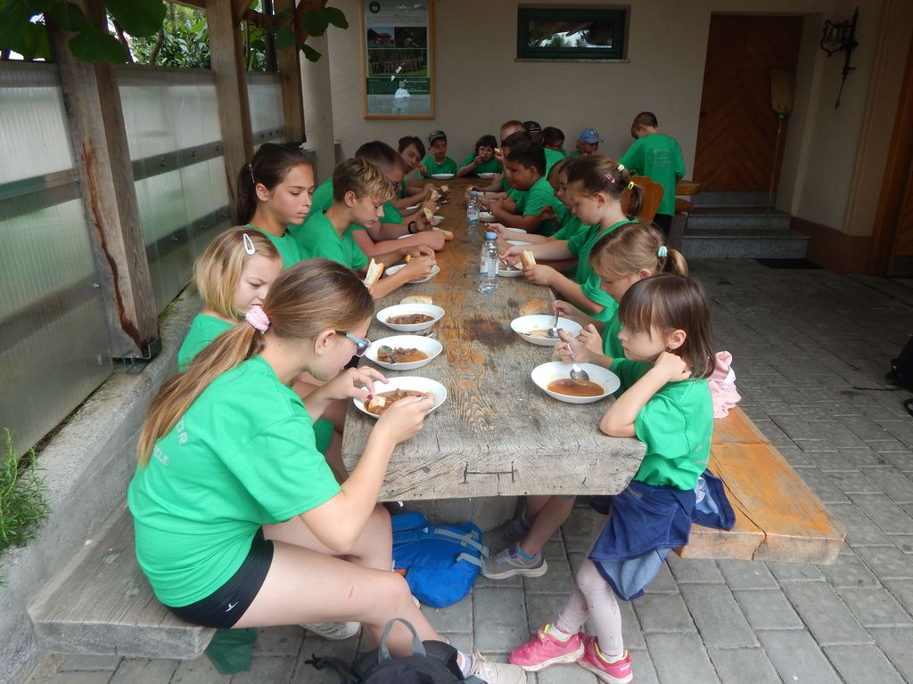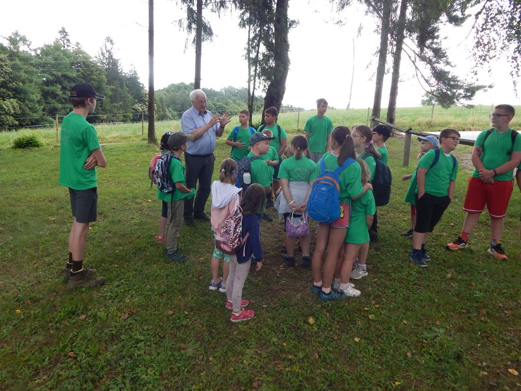 Začelo se je z jutranjim sprehodom po lovskem parku, kjer jim je skrivnosti življenja drevesnih vrst naših gozdov, njihovih plodov in skrivnostnih gozdnih živalskih prebivalcev drevsenih dupel in krošenj razkril upokojeni gozdarski maček, inženir Jože Šinkovec. Jutranji sprehod po mini gozdnem okolju je ravno toliko vzpodbudil želodčke mladih ljudi, da so z veseljem nato pristopili k zajtrku, ki sta ga pripravila prizadevna člana LD Dean Vozelj in Emil Majerič.