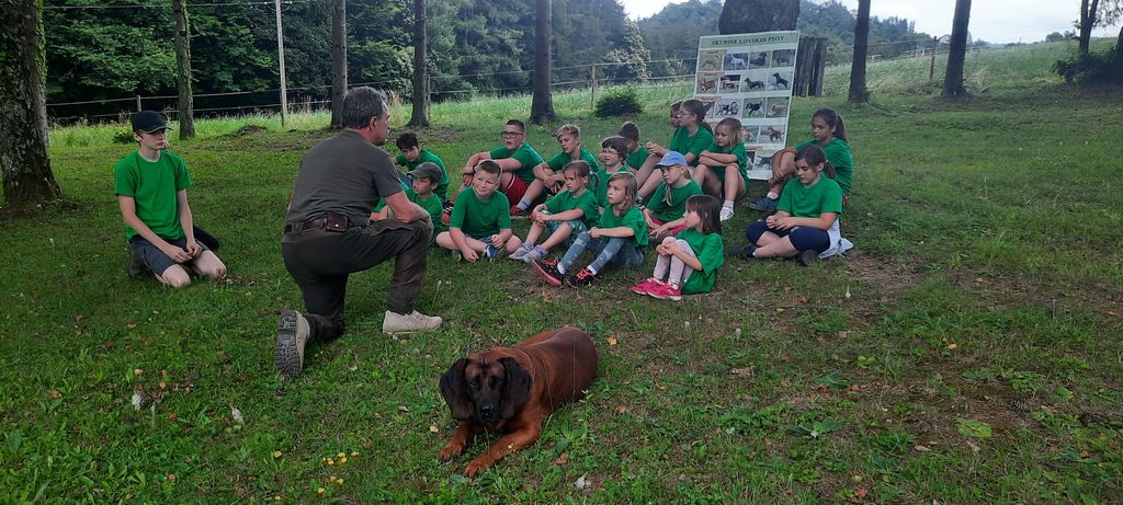 Po kosilu pa novo presenečenje – otrokom se je pridružil Jani Krivec, član sosednje LD Radeče in priznani lovski kinolog ter kinološki sodnik. Jani je otroke s pomočjo svojega lovskega psa, hanoveranskega barvarja Bokota in slikovnih pripomočkov vpeljal v skrivnosti različnih lovskih pasem, njihovega šolanja, prehrane, iskanja ranjene divjadi po krvni sledi in obnašanja v družbi lovcev ter na samem lovu.