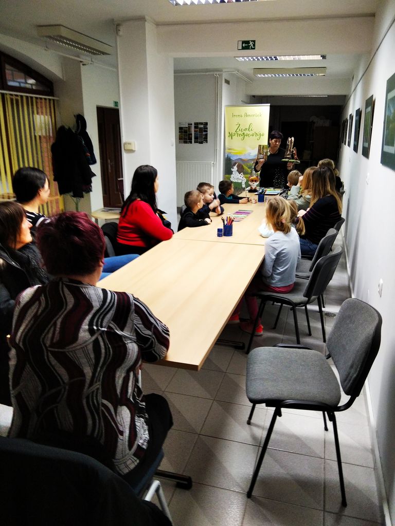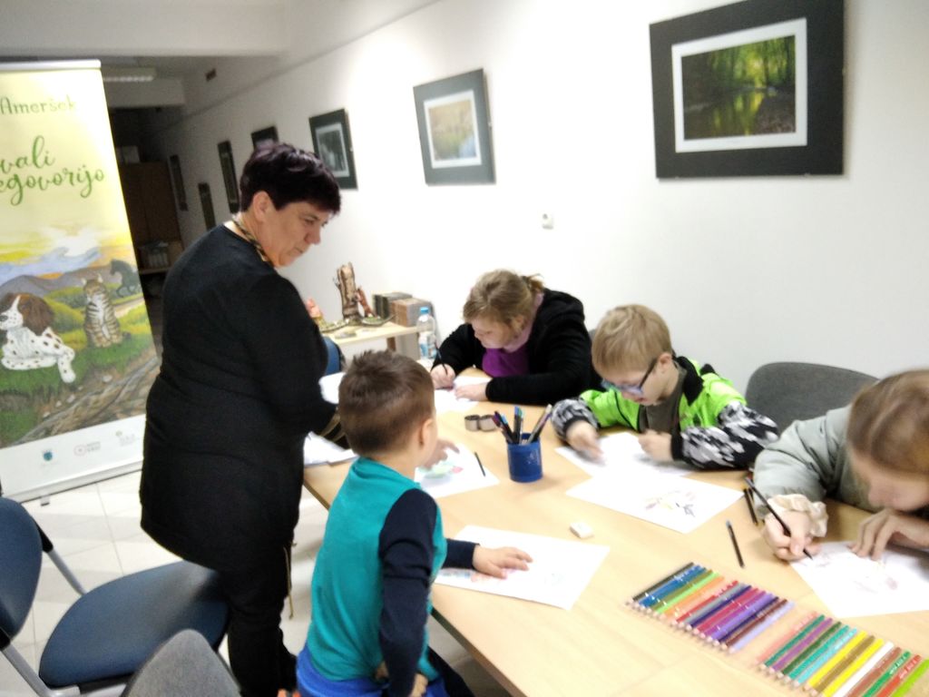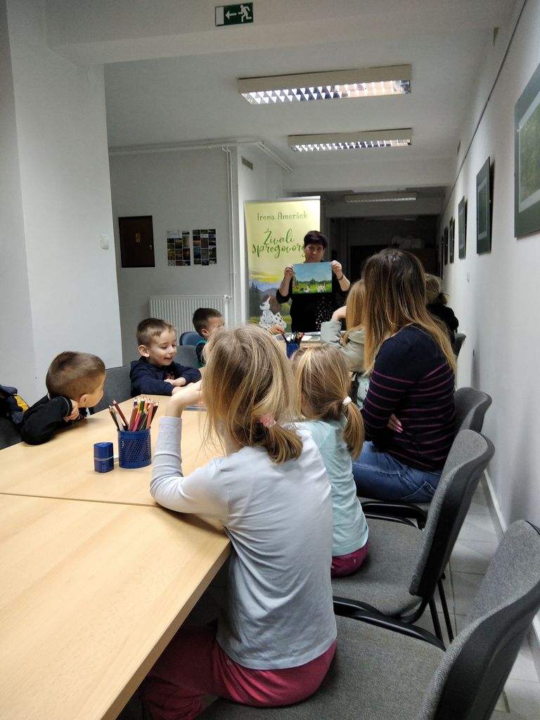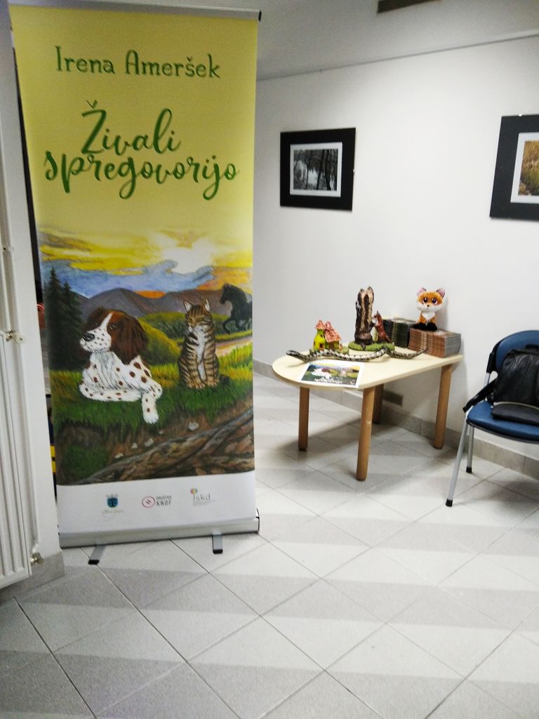 V četrtek, 23. februarja 2022, smo imeli v Galeriji Krmelj 6. druženje ob knjigi za otroke in odrasle Tokrat smo medse povabili Ireno Ameršek iz Sevnice, avtorico in ilustratorko dveh otroških knjig. Prvo, Zgodbo o lisici, je izdala in nam jo predstavila že leta 2019. Tokrat pa nam je na zanimiv način predstavila svojodrugo knjigo Živali spregovorijo.  Pokazala nam je številne ilustracije, ki jih je narisala za knjigo, več kot 30 slik na A3 formatu. Otrokom je prebrala eno zgodbo iz knjige, ki so jo z zanimanjem poslušali. Narisala je tudi pobarvanke z liki iz knjige, ki so jih otroci z navdušenjem pobarvali. Občudovali smo originalno izdelano kačo in še druge njene umetnine. Prostor v Galeriji smo lepo napolnili, saj nas je bilo skupaj 15, od tega 8 otrok - nekaj šolarjev in mlajših predšolskih otrok ter 7 odraslih. Skupaj smo preživeli prijetno urico ob druženju, Irena pa nam je ob zaključku večera tri knjige tudi podarila, tako da jih lahko pogledate in preberete tudi tisti, ki tokrat niste utegnili priti.