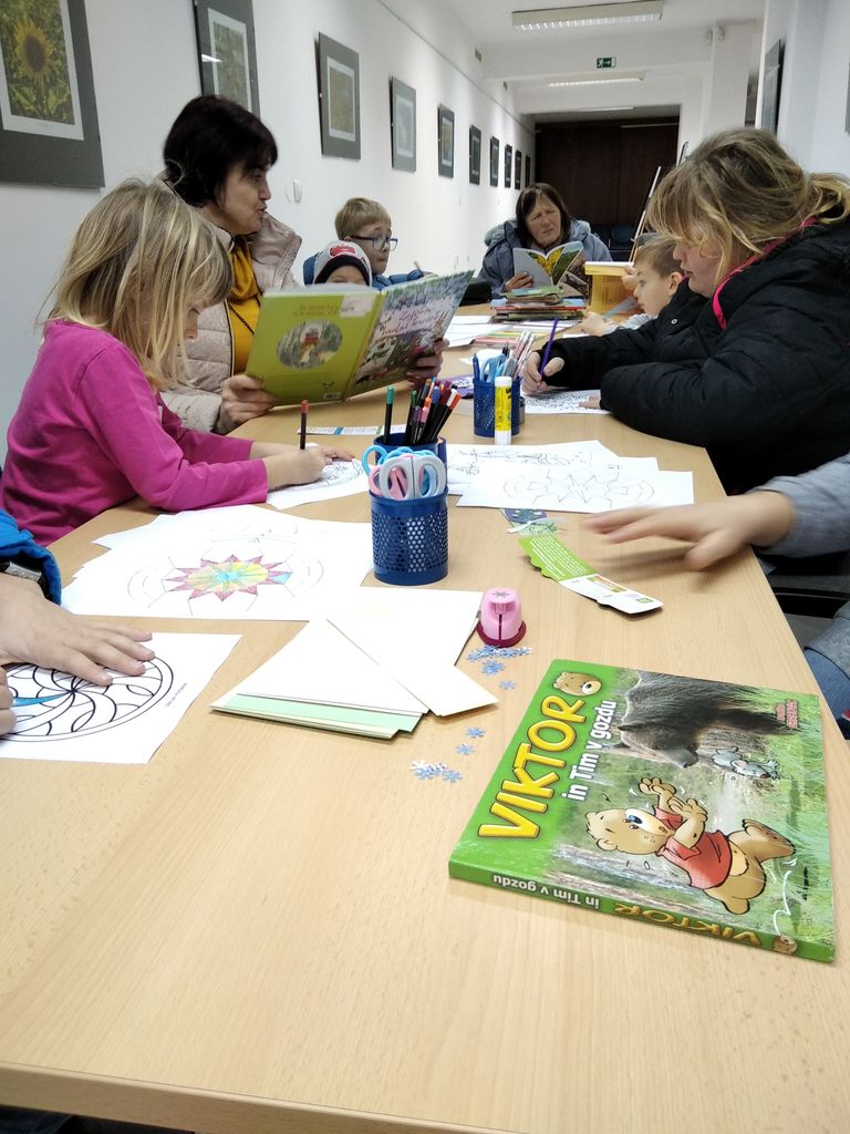 Prebrali smo pravljico z naslovom Zajčkov bralni krožek, ki govori o zajčku, ki je imel zelo rad knjige in je skrivaj hodil v knjižnico. Potem pa smo z otroci ustvarjali kazalke za knjige, jih polepili z majhnimi zlatimi in modrimi snežinkami ter barvali zimske pobarvanke in mandale. Skupaj smo preživeli prijetno urico ob druženju, ustvarjanju in pogovoru o različnih temah: preživljanju novega leta, kuhanju in drugih zanimivostih.