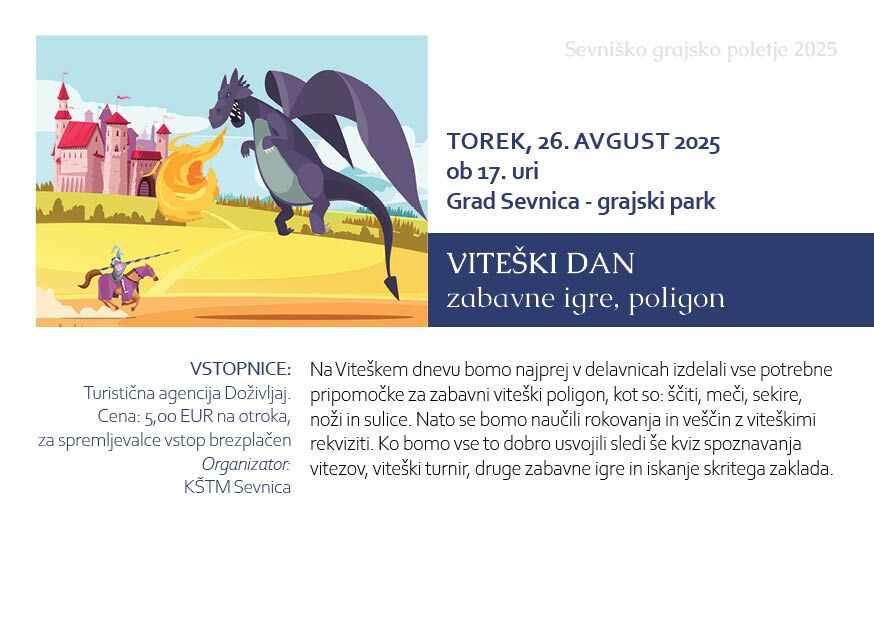 Vabimo vas, da se nam pridružite na nepozabnem Viteškem dnevu na čudovitem gradu Sevnica, kjer se bo čas za en dan ustavil in vas popeljal v dobo jeklenih oklepov, bleščečih mečev in slavnostnih dvornih plesov.