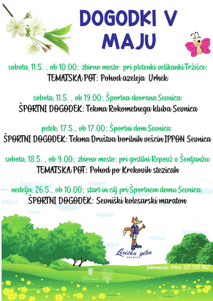 Za zaključek pa si rezervirajte 26. maj, ko se dobimo na kolesarski maraton. Start in cilj bosta pri Športnem domu Sevnica. Bodite del tega navdušujočega dogodka in uživajte v športnem duhu.