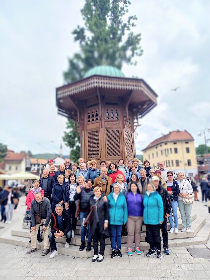 Na pot proti Sarajevu smo se odpravili v deževnem petkovem jutru, ki pa ni moglo pokvariti dobrega razpoloženja udeležencev, kakor tudi ne dolga vožnja v bosanskohercegovsko prestolnico. Dobro razpoloženi smo se že kmalu po prihodu v Sarajevo zbrali na pevskih vajah, nato pa se srečali s predsednico Slovenskega društva Cankar iz Sarajeva, gospo Verico Džindo, ter skupaj z njo začeli spoznavati čare in utrip mesta, še več o njem pa smo izvedeli, ko nas je v soboto dopoldan popeljala po znameniti Baščaršiji in bližnjih predelih mesta ob Miljacki.