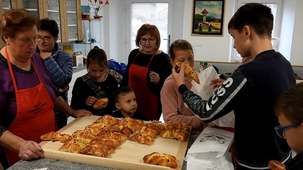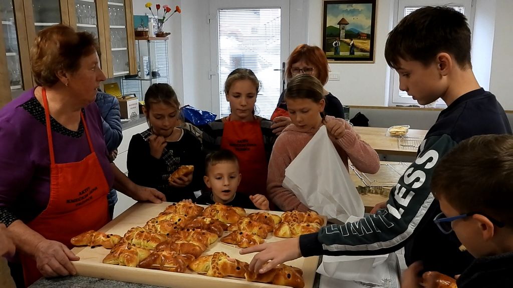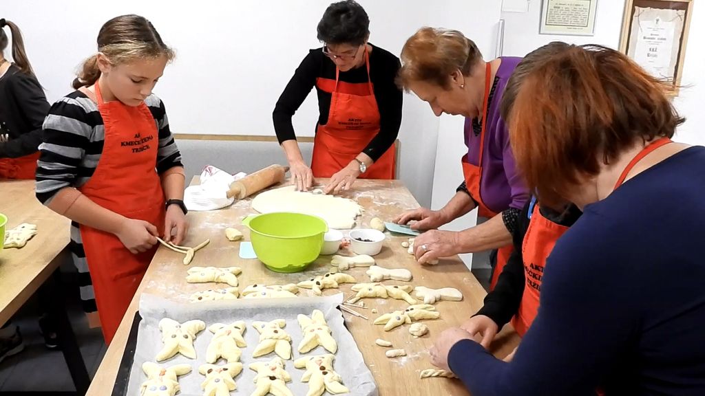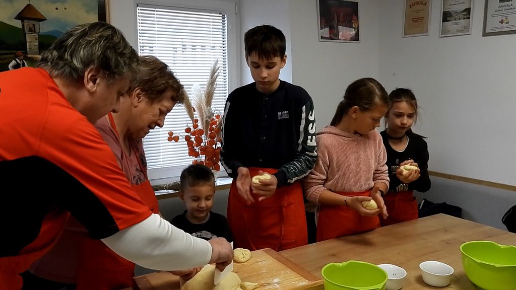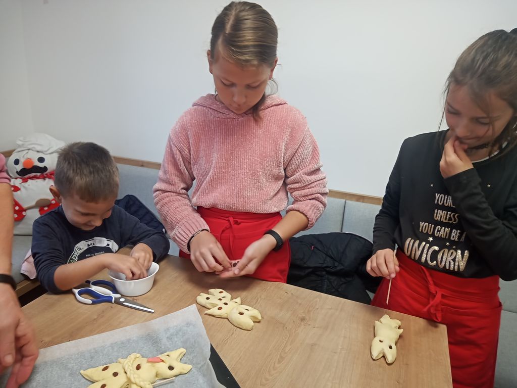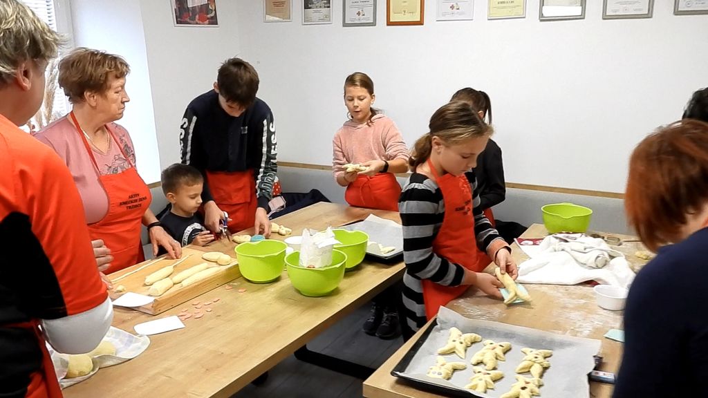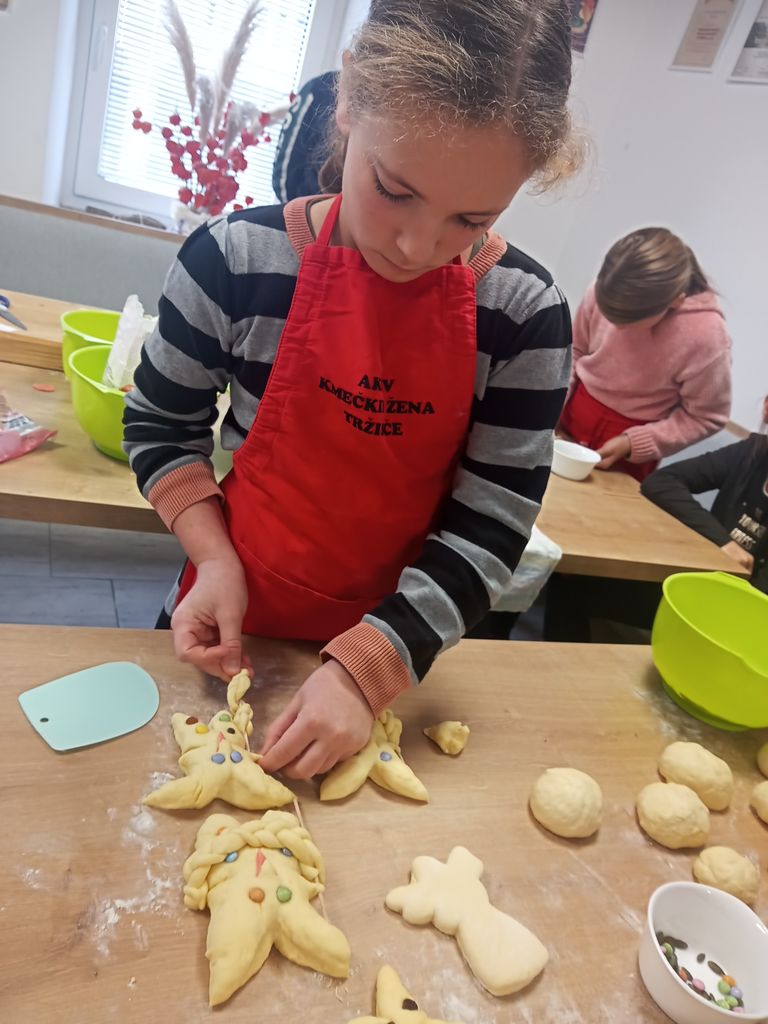 Malo pred Miklavževim prihodom pa smo povabile otroke na pekovsko delavnico parkeljnov in angelčkov. Nadeli smo jim predpasnike. Ko je bilo kvašeno testo pripravljeno, so z zanimanjem opazovali članice, kako prikazujejo postopek izdelave. Nato so še sami z veseljem in navdušenjem vzeli v roke kepico testa in ga oblikovali v parkeljna ali angelčka. Parkeljčkom so vtisnili še oči iz rozin, bučnih semen ali pisanih okroglih bonbončkov. Dodali so še leseno palčko in spleteno verigo iz testa, otroci pa se jih niso nič ustrašili. Lepo okrašeni so bili tudi angelčki. Izdelke so položili tudi na pekač. Dovolj vzhajane in premazane z jajcem so jih postavili v že ogreto pečico. Pečene smo potem pustili, da se malo ohladijo, nato smo jih nekaj z užitkom še pokusili. Res so bili odlični. Otroci pa so svoje unikatne pekovske izdelke zložili v papirnate vrečke in že nestrpno čakali na starše, da jih pokažejo in odnesejo domov.