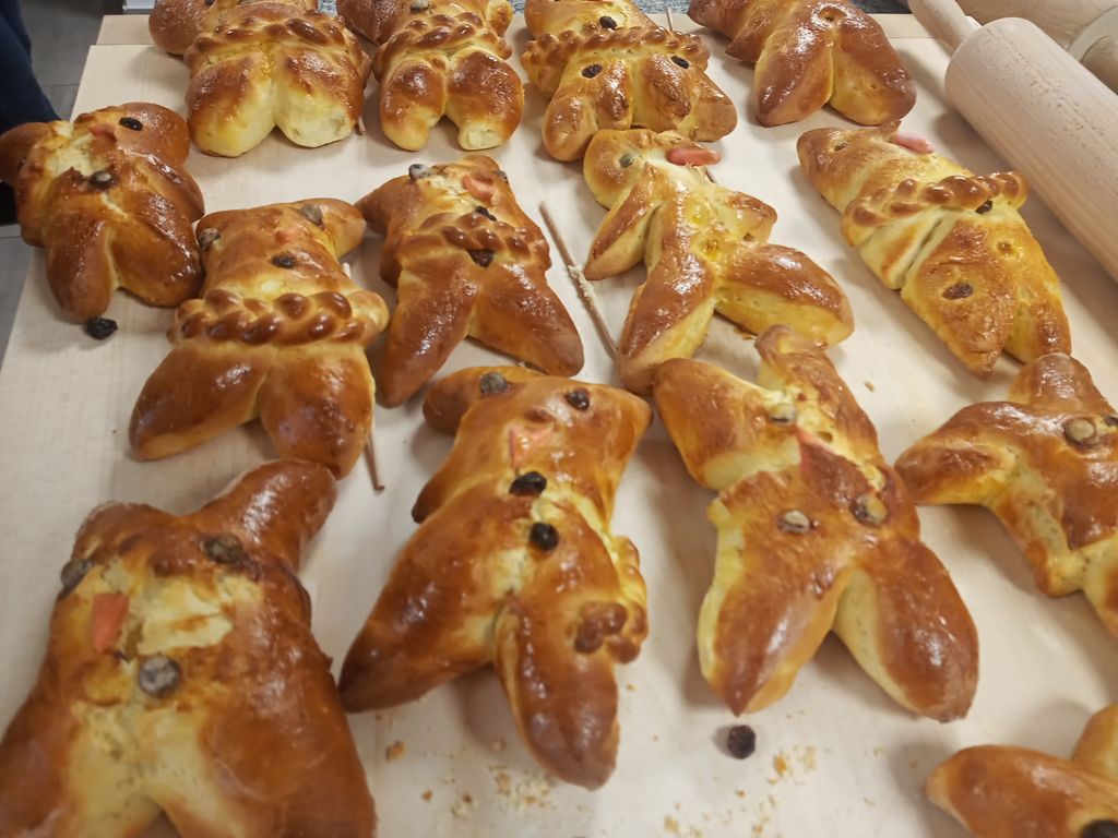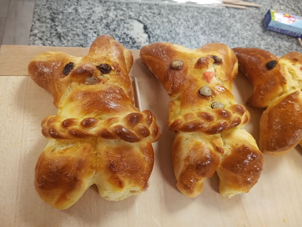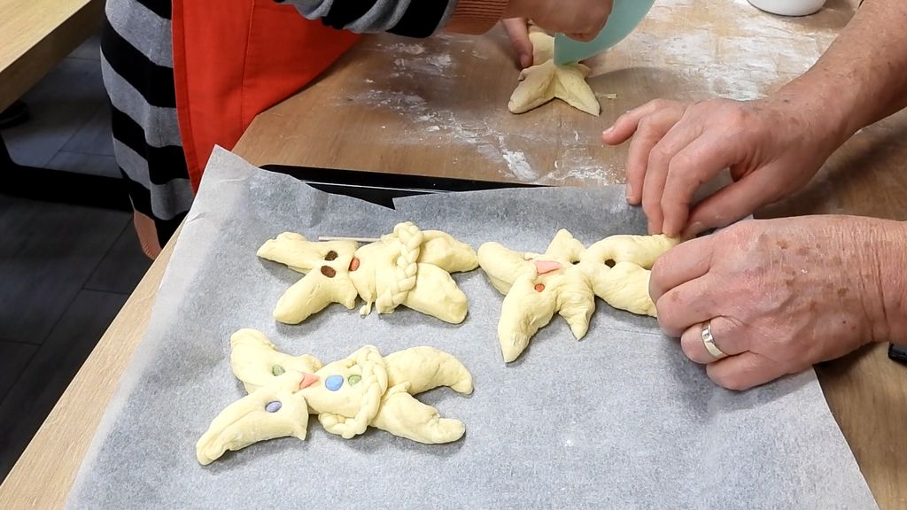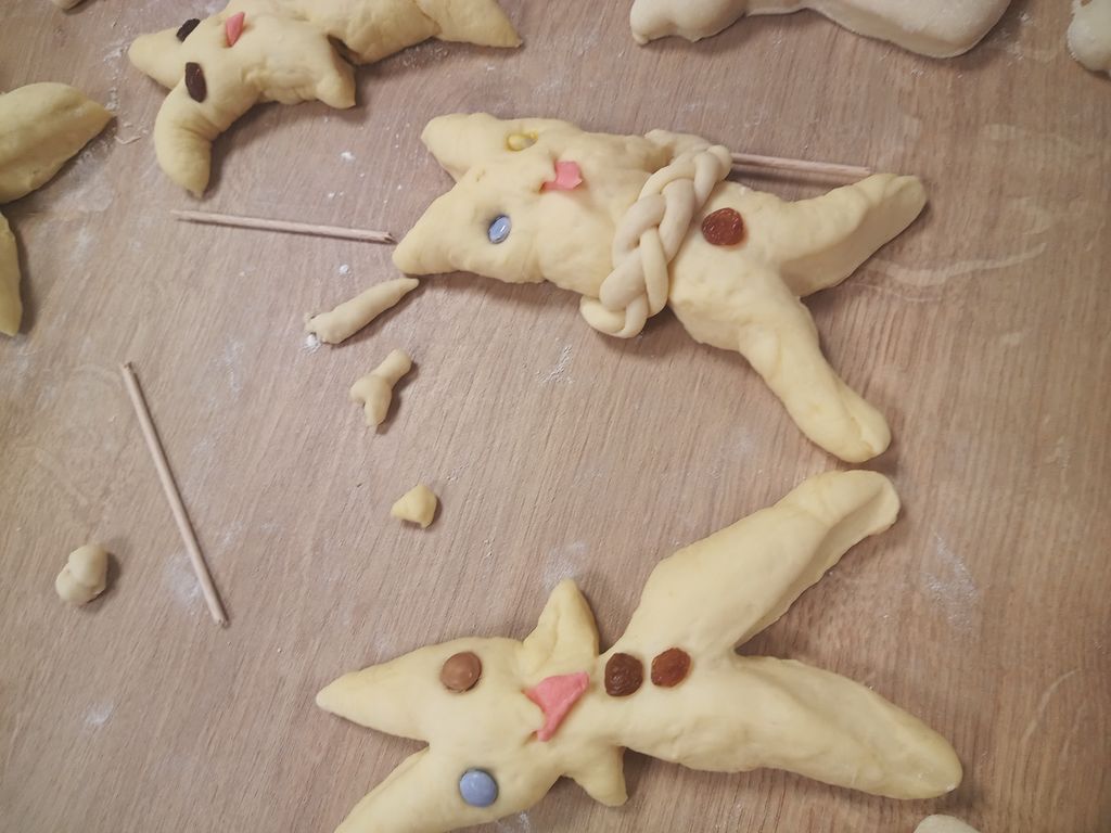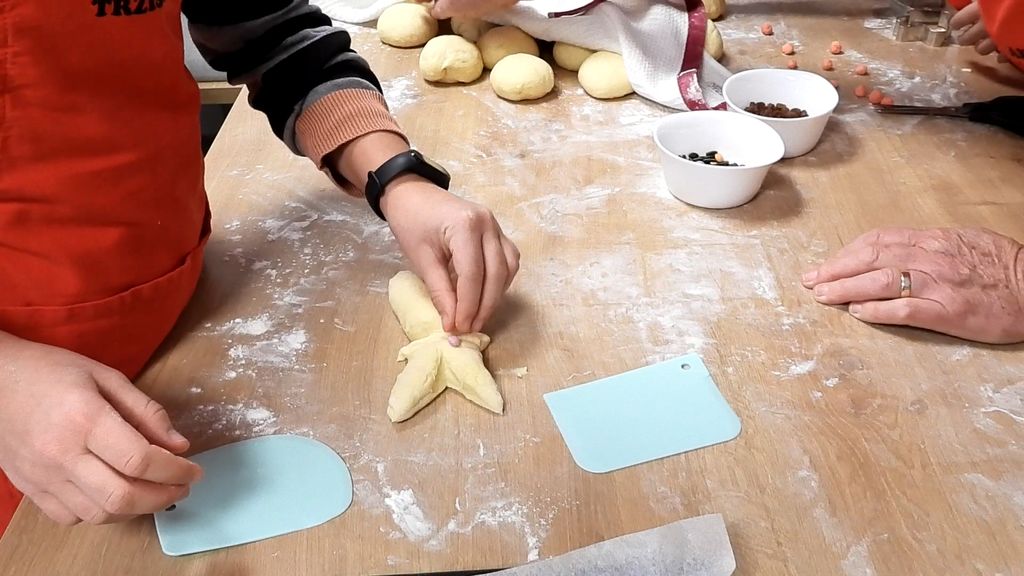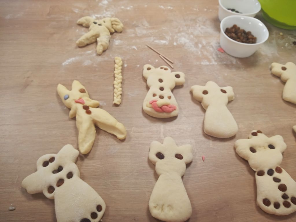 Malo pred Miklavževim prihodom pa smo povabile otroke na pekovsko delavnico parkeljnov in angelčkov. Nadeli smo jim predpasnike. Ko je bilo kvašeno testo pripravljeno, so z zanimanjem opazovali članice, kako prikazujejo postopek izdelave. Nato so še sami z veseljem in navdušenjem vzeli v roke kepico testa in ga oblikovali v parkeljna ali angelčka. Parkeljčkom so vtisnili še oči iz rozin, bučnih semen ali pisanih okroglih bonbončkov. Dodali so še leseno palčko in spleteno verigo iz testa, otroci pa se jih niso nič ustrašili. Lepo okrašeni so bili tudi angelčki. Izdelke so položili tudi na pekač. Dovolj vzhajane in premazane z jajcem so jih postavili v že ogreto pečico. Pečene smo potem pustili, da se malo ohladijo, nato smo jih nekaj z užitkom še pokusili. Res so bili odlični. Otroci pa so svoje unikatne pekovske izdelke zložili v papirnate vrečke in že nestrpno čakali na starše, da jih pokažejo in odnesejo domov.