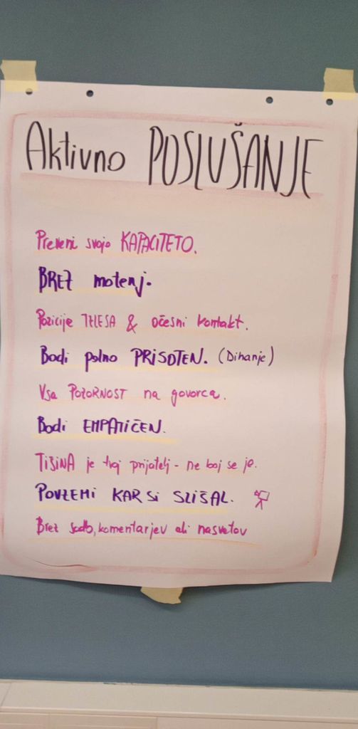 V zadnjih letih je med mladimi čedalje bolj prisotna problematika duševnega zdravja. To potrjuje tudi raziskava Mladina 2020, ki ugotavlja, da se je delež mladih, ki se srečujejo s stresom in stiskami, v primerjavi z letom 2010 več kot podvojil. Med pandemijo zaradi covida-19 so se zaradi različnih razlogov duševne stiske pri mladih povečale, predvsem anksioznost, osamljenost, samomorilnost, pomanjkanje smisla, motivacije ipd. Zaradi navedenega smo se zaposleni v MC Sevnica z veseljem odzvali vabilu MC Zagorje na dvodnevno usposabljanje za delo z otroki in mladostniki v stiski z naslovom Slišati in biti slišan/-a, ki je eden izmed rezultatov projekta strateškega partnerstva Me slišiš? Slišim te, financira pa ga program Erasmus+. Namen projekta je razviti in raziskati podporne mehanizme za delo z mladimi z manj priložnostmi, ki doživljajo stisko ter oblikovati sistem izobraževanja za prostovoljce in mladinske delavce v sklopu dnevnih centrov, uličnega dela in drugih aktivnosti za mlade. Na delavnicah smo spoznali, kdo so mladi v stiski in zakaj se jim to zgodi, postavljanje meja in našo vlogo pri delu z mladimi, spoznali smo orodja, metode in različno prakso. Čas pa smo namenili tudi pridobivanju izkušenj z igro prizorov, s katerimi smo lahko izkusiti situacije, v katerih nismo vedeli, kako se odzvati, zato smo raziskovali možne reakcije na specifične situacije. Aktivnosti so bile načrtovane dinamično, nekaj je bilo individualnega dela, več pa dela v manjših skupinah in parih.
