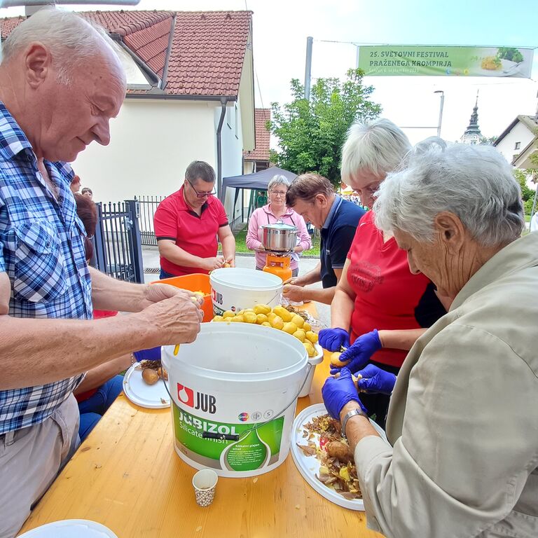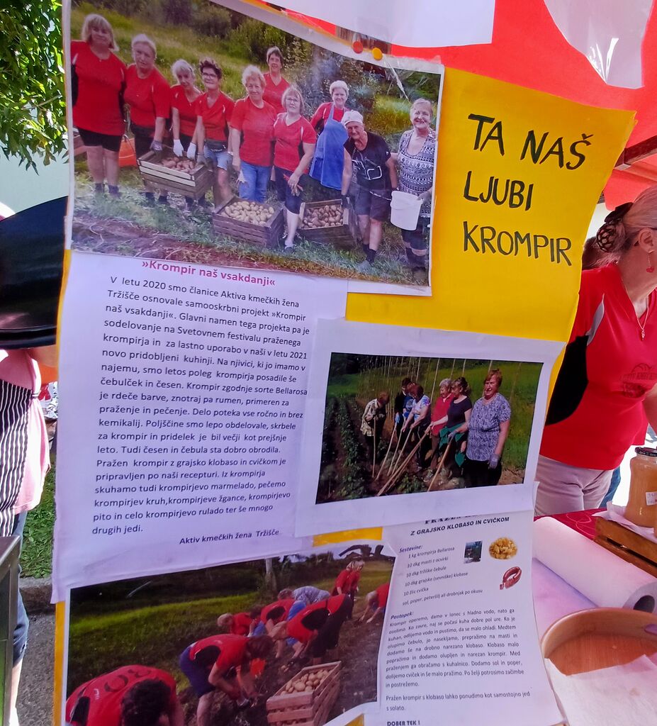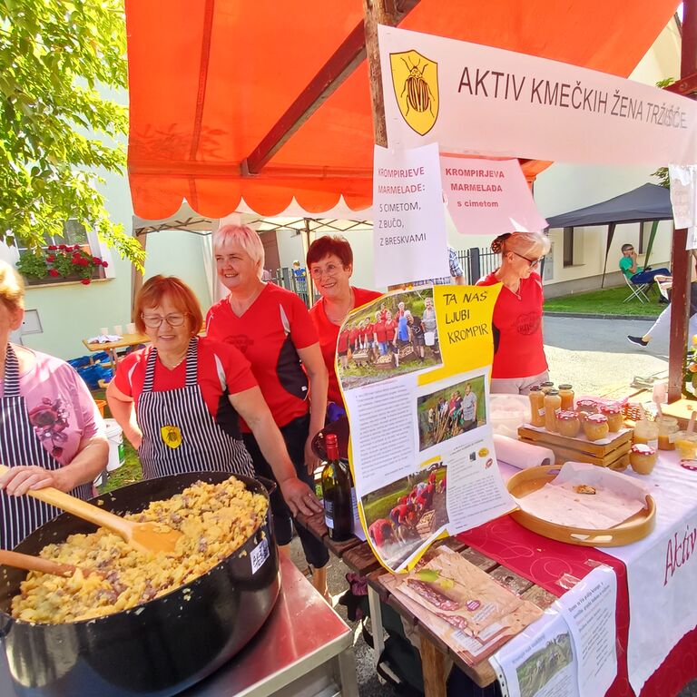 Na prvo septembrsko soboto smo se članice Aktiva kmečkih žena Tržišče , ki delujemo v okviru Društva kmetic Sevnica udeležile 25. Svetovnega festivala praženega krompirja v Šenčurju pri Kranju. Ta kraj je zelo znan po semenskem krompirju. Pridružilo se nam je nekaj podpornih članov za pomoč pri prenašanju težkih bremen: plin, gorilec, krompir in še mnogo ostalega pribora, vključno z mizami in klopmi. V dopoldanskih urah smo prispeli z avtobusom do stojnice, ki jo je postavil organizator, TD Šenčur in Občina Šenčur. Del naše ekipe jo je okrasil, drugi del pa se je lotil priprave krompirja. Glavna kuharica Jožica s pomočnicami, je po našem lastnem receptu spražila čebulo in klobase, nato je dodala narezan krompir, začinila in proti koncu zalila še s cvičkom. Ob 12.uri se je pričela slavnostna otvoritev s pozdravom predsednika Društva za priznanje praženega krompirja kot samostojne jedi, Alojza Gregorčiča, doma iz Mokronoga, kjer se je prvič začelo praženje krompirja. Sledila je povorka starih traktorjev , sprevod strojev in naprav, večinoma lesenih, katere so včasih uporabljali za sajenje, sortiranje ali prevažanje krompirja. Pripeljala se je tudi Marija Terezija. Prav ona je v tistih časih ukazala, da se mora saditi krompir, da bi pregnali lakoto. V Evropo pa ga je prinesel Krištof Kolumb.