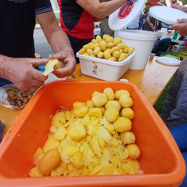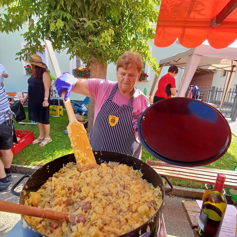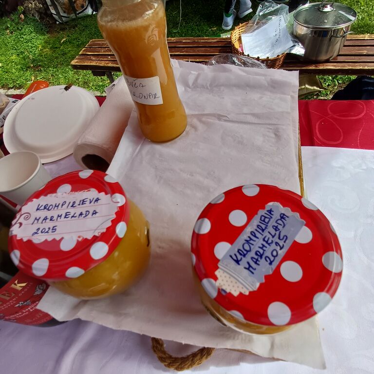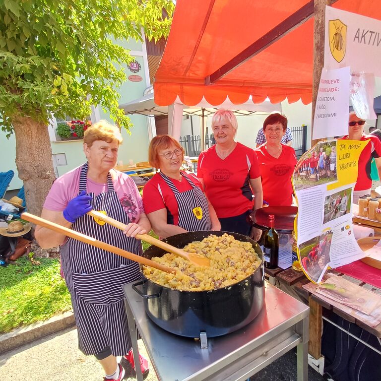 Pražen krompir smo lahko začeli deliti šele po dvanajsti uri, ko je godba odigrala krompirjevo himno. Tako med drugim veleva deset zapovedi, ki jih je sprejelo Društvo za priznanje praženega krompirja (DPK). Prav tako zapoveduje, da mora vsaka pražilska ekipa spražiti najmanj 50 kg krompirja in ga deliti brezplačno. Pa si zdaj predstavljajte koliko krompirja se je na festivalu spražilo. Na tisoče kg se ga je pojedlo, pa še zmanjkalo ga je. Ta jubilejni festival je obiskala neverjetno velika množica jedcev. Za degustacijo smo spekle tudi krompirjevo pito, krompirjev kruh , potico in še marmelado iz krompirja. Malce nenavadna, ampak odlična. Na naši samooskrbni njivi v Tržišču že nekaj let sadimo krompir sorto Bellarosa, namenjen prav za ta festival, pa tudi za kuharske delavnice in pogostitve na družabnih dogodkih. Pridelamo tudi čebulo, korenje in še druge povrtnine. Na festivalu je pražilo krompir več kot 60 ekip iz Slovenije in tujine. Iz sevniške občine jih je bilo šest, samo iz Tržišča pa kar štiri. Poleg Akž, še TD, DU in Društvo Hrast Tržišče. Za sodelovanje smo prejeli priznanje in predpasnik. Organizatorji so se res potrudili in pripravili lep in zanimiv program, ki je trajal še potem, ko smo se dobre volje in s praznimi lonci odpeljali proti domu. Tudi vreme je bilo primerno. Prihodnje leto pa vas vabimo v Prekmurje v Lipovce, v občini Beltinci, kjer bo spet dišalo po odličnih sevniških grajskih klobasah in najboljšem malkovškem cvičku.