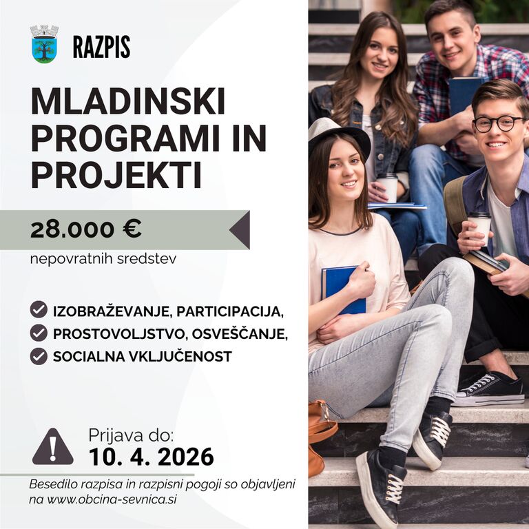 Javni razpis za sofinanciranje mladinskih programov in projektov ter programov za mlade v občini Sevnica v letu 2026 predvideva sofinanciranje mladinskih programov in projektov, ki so namenjeni krepitvi in širitvi vrednot prostovoljnega dela in dela med mladimi, spodbujanju osebne avtonomije mladih in njihovi socialni integraciji ter druženju in uresničevanju njihovega interesa, in sicer predvsem spodbujanju in razvijanju neformalnih oblik vzgoje, izobraževanja in usposabljanja za večje kompetence mladih, spodbujanju delovnih navad, prostovoljstva, solidarnosti in medgeneracijskega sodelovanja mladih, spodbujanju zdravega, aktivnega načina življenja mladih, dvigu kakovosti življenja in aktivnemu preživljanju prostega časa otrok in mladine, spodbujanju in razvijanju raziskovalnega, inovativnega in ustvarjalnega dela, vključevanju mladih z manj priložnostmi, spodbujanju javnega dialoga o družbenih vprašanjih ter aktivni participaciji mladih pri upravljanju družbe, dejavnosti med šolskimi počitnicami, osveščanju in spremljanju drugačnosti, zmanjševanju diskriminacije in socialne izključenosti mladih ter preprečevanju nasilja med mladimi in nad mladimi ter razvijanju sodelovanja z zavodi, ustanovami in društvi, ki delajo na področju dela z otroki v občini Sevnica. Okvirna vrednost razpisa je 28 tisoč evrov, rok za oddajo prijav pa je do vključno 10. aprila 2026.