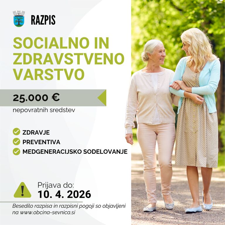 Javni razpis zbiranja predlogov za sofinanciranje programov na področju socialnega in zdravstvenega varstva v občini Sevnica v letu 2026 predvideva sofinanciranje stroškov dela in materialnih stroškov za izvajanje programov. Okvirna višina razpoložljivih sredstev znaša 25 tisoč evrov, rok za oddajo prijav je do vključno 10. aprila 2026.