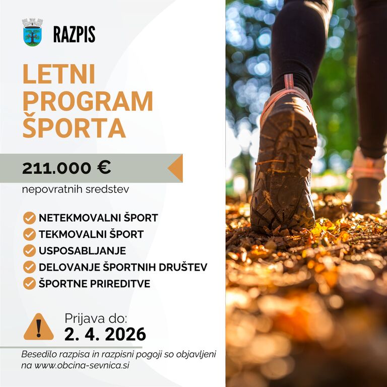 Javni razpis za sofinanciranje izvajalcev letnega programa športa v občini Sevnica v letu 2026 predvideva sofinanciranje netekmovalnega športa, v okviru katerega se med drugim izvaja prostočasna športna vzgoja otrok in mladine ter športne aktivnosti in rekreacija za starejše in osebe s posebnimi potrebami, sofinanciranje tekmovalnega športa, v okviru tega športnih aktivnosti otrok in mladine, odraslih in invalidov, ki so usmerjene v kakovostni in vrhunski šport, sofinanciranje izobraževanj, usposabljanj in izpopolnjevanj strokovnih delavcev v športu, sofinanciranje organiziranja rekreativnih športnih prireditev ter sofinanciranje delovanja športnih zvez in športnih društev. Okvirna vrednost razpisa je 211.000 evrov. Rok za oddajo vlog je do vključno 2. aprila 2026.