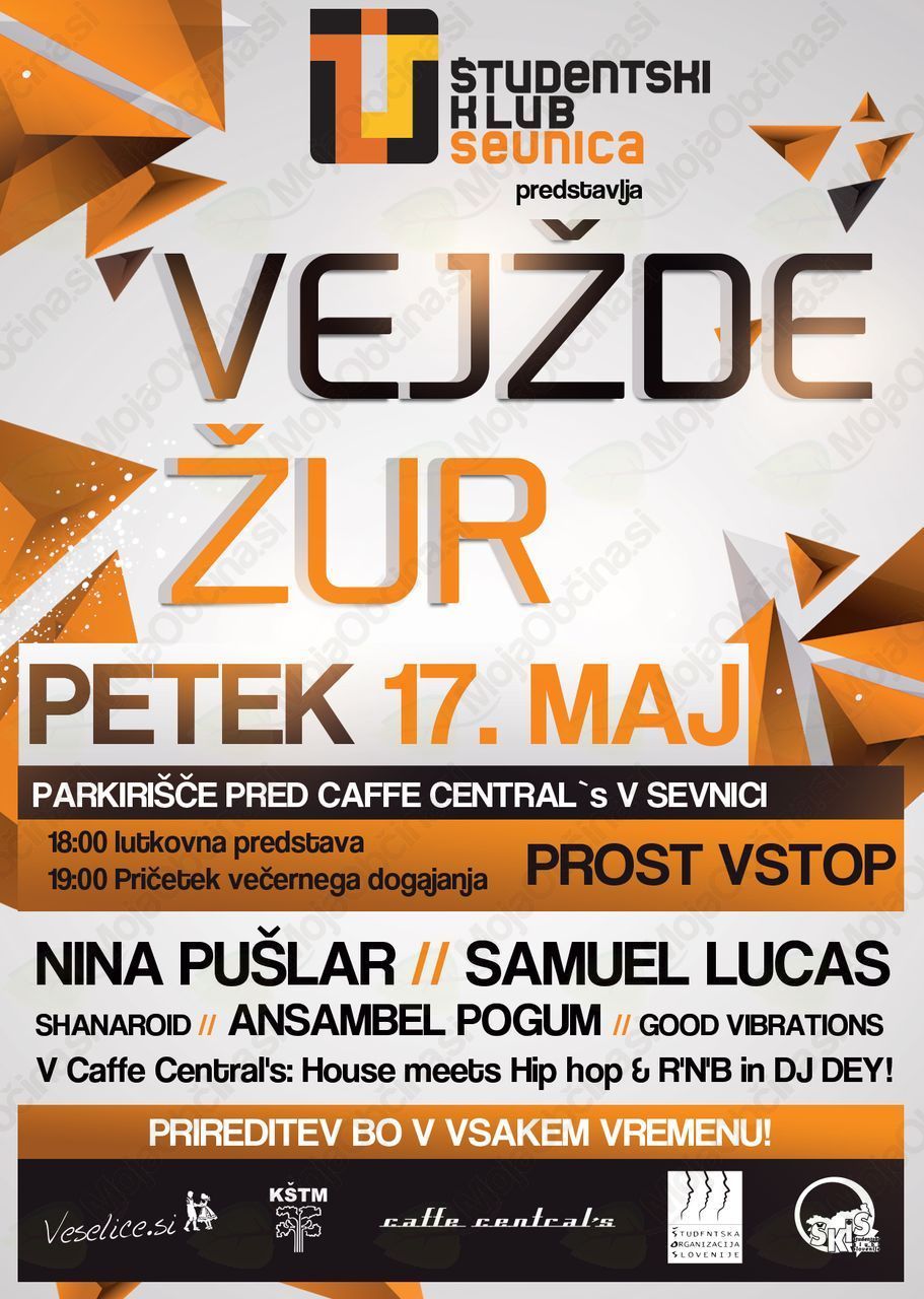 Študentski klub Sevnica bo letos praznoval 10. obletnico delovanja, praznovanje ob jubileju pa bo potekalo na že tradicionalnem Vejžde žuru, v petek 17. 5. 2013 na parkirišču pred Caffe Central's v Sevnici. Tudi letos bo pester program, ko se bo najprej odvijala predstava za otroke, kasneje pa tudi koncertni del, na katerem bodo letos nastopili Good Vibrations iz Krškega, sevniški rockerji Shanaroid, odlična glasbenika Samuel Lucas in Nina Pušlar, za zaključek pa bo poskrbel ansambel Pogum. Da pa bo poskrbljeno za vse okuse bo v Caffe Central'su poskrbel priznani slovenski DJ, DJ DEY, ki bo poskrbel za različne glasbene ritme. Vstopnine na dogodek ne bo, žur pa bo. Vejžde!