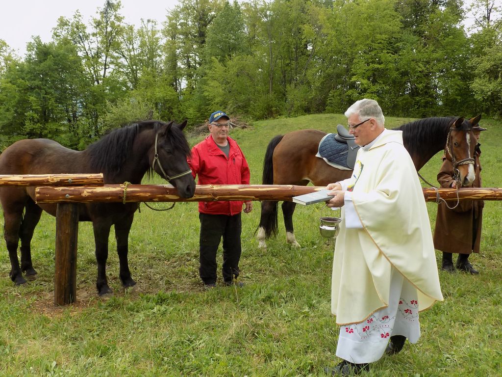 Na lepo ozelenel travnik skrit v objem mlado olistanih dreves gozda  je privabilo veliko število obiskovalcev in občudovalcev konj.Po blagoslov so svoje lepotce ponosno prijezdili na travnik,kjer je prostor našla tudi dvovprega,pod okriljem mogočnega križa na katerem je pripet Jezus v naravni velikosti človeka.Na novih privezih so konje konjeniki lepo pripravili na blagoslov.Sveta maša je potekala v cerkvici Sv. Jurija, nato pa so vsi obiskovalci prispeli na bližnji travnik,kjer so konji potrpežljivo čakali na privezih.Duhovni pomočnik Štefan Vozlič iz Sevnice je  konje blagoslovil, predsednik društva konjerejcev in konjenikov Sevnica g.Anton Grilc je vsakemu konju podelil blagoslovljen kruh.Konjeniki, konjerejci  ter obiskovalci so si izmenjavali rejske ter konjeniške izkušnje ob rujni kapljici in malici,ki sta jo darovala Anton Grilc in Jože Žnidarič,topli sončni žarki pa so poskrbeli ,da je bilo pregnano deževje za prijetno druženje.