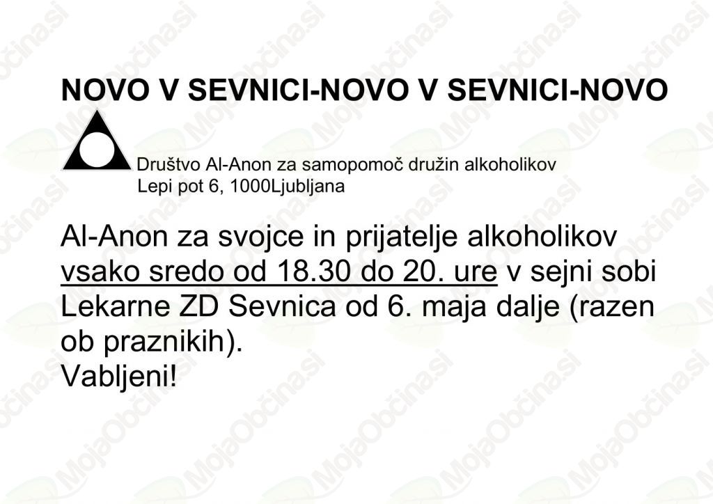 Al-Anon za svojce in prijatelje alkoholikov, vsako sredo od 18.30 do 20. ure v sejni sobi Lekarne ZD Sevnica od 6. maja (razen ob praznikih).