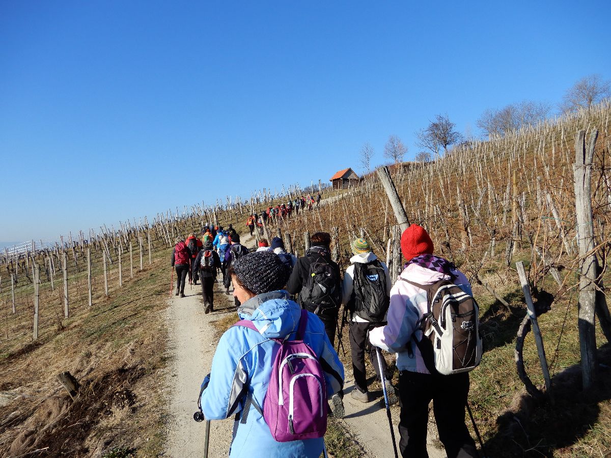 Vodniki Planinskega društva Brežice so popeljali kar dolgo kolono najprej med vinograde: polagamo smo se vzpenjali in uživali v razgledih. Sonce je prijetno sijalo, vendar je bil zrak mrzel, sploh, če je zapihal še veter. Pod cerkvijo svetega Vida v zaselku Bošt, ki je verjetno bila zgrajena v 16. stoletju in včasih obdana z obrambnim zidom, smo občudovali lepo ohranjeno staro hišo, malo naprej pa smo se čudili suhemu neobranemo grozdju v vinogradih.
