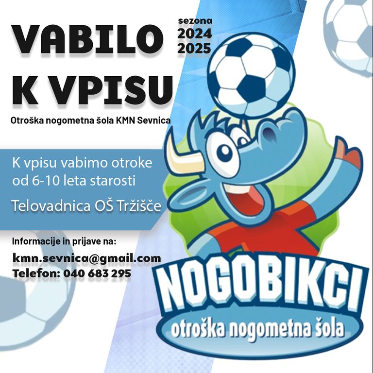 Veseli nas, da smo z Osnovno šolo Tržišče sklenili dogovor o sodelovanju in izvajanju treninga malega nogometa, zato KMN Sevnica vabi k vpisu otrok od 6 do 10 leta starosti v otroško šolo malega nogometa. Informacije in prijave na: