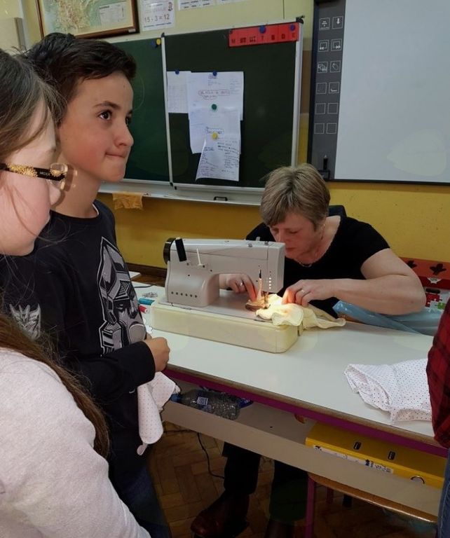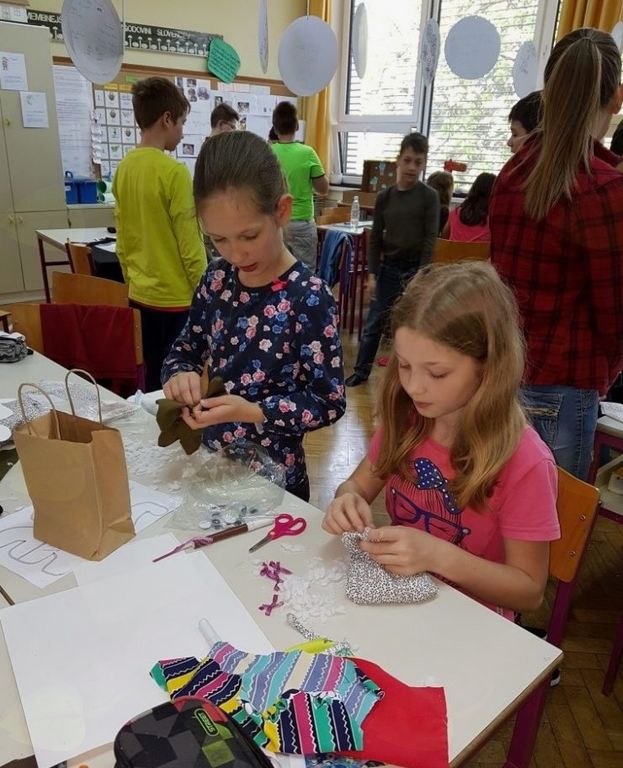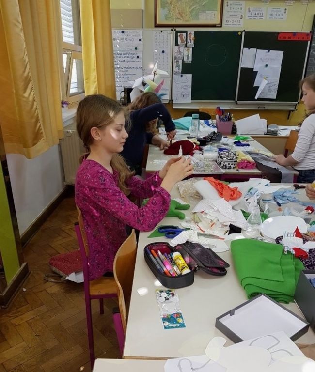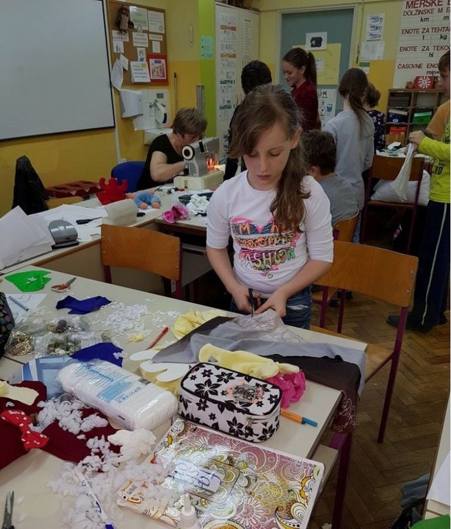 Počakali smo našo spremljevalko, gospo Danijelo, in se vrnili v šolo. Po malici smo z veseljem pričeli z ustvarjanjem svojih izdelkov. Joj, kako sem bila nestrpna in kar nisem vedela, za kaj bi se odločila. Na izbiro smo imeli izdelovanje žabice, peresnice ali blazine. Jaz sem naredila blazino v obliki srčka v rdeči barvi s čipko na sredini. Najprej sem izrezala šablono za obris, ki sem jo čez čas posodila ostalim sošolcem. Ko sem jo obrisala, sem srček še hitro in previdno izrezala in vajo ponovila za drugo stran omenjene okrasne blazine. Na pomoč pri šivanju nam je priskočila tudi Julijina mamica in nam na šivalni stroj sešila izdelke. Delčka blazine ni zašila do konca, da sem jo lahko kasneje napolnila s polnilom, tako je bil videti še večji, lepši in predvsem prijetnejši na otip. Medtem ko se je moj srček šival, sem z veseljem pomagala sošolki Adriani obrisati šablono na njeno blago in izrezati srček. Zelo sem se razveselila svojega končnega izdelka, saj je bil zares nekaj posebnega! Zelo mi je bil všeč tudi Emin zeleni srček, saj je bil v primerjavi z mojim nekoliko večji in zelo napolnjen s polnilom. Skoraj ob zaključku dela smo lahko odšli v sosednji, 5. c razred, kjer smo si ogledali kakšne izdelke izdelujejo oni. Povabilo in obisk mi je zelo godil, saj me je zanimalo, kaj je uspelo narediti njim. Tudi oni so bili zelo ustvarjalni. Na koncu pouka smo še dan dejavnosti vsi skupaj analizirali in ovrednotili. Vsi smo ga ocenili z oceno pet, saj je bil vsem zelo všeč!