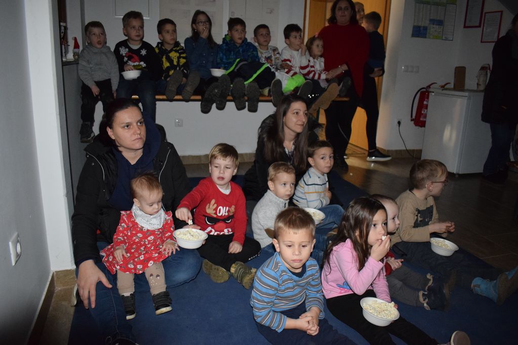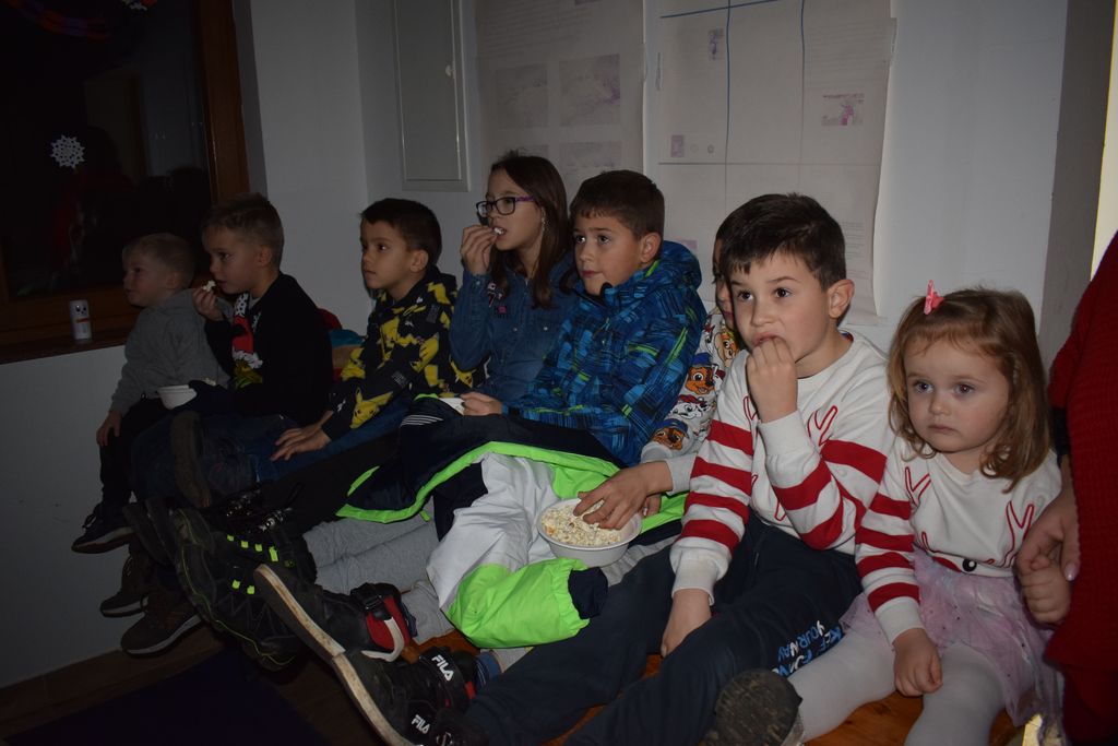 Da so otroci lažje pričakali obisk Dobrega moža so si v Domu ogledali risani film. Izgledalo je kot v pravem kinu, saj so med spremljanjem uživali kokice in napitke. Razpoloženje se je dvignilo še s prepevanjem božičnih in tudi novoletnih pesmi, nato se na vratih končno pojavi Božiček v spremstvu škrata.