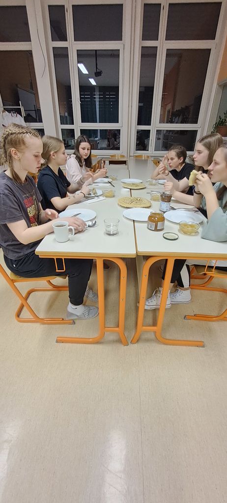 O Aninem življenju, o življenju Židov v času nacizma in holokavstu ter o Nizozemski smo naredile tudi plakate. Po slastni večerji, učiteljici Gordana Kenda Kozinc in Vesna Butkovič sta nam spekli odlične palačinke in skuhali jabolčni kompot, pa smo si ogledale igrani film Dnevnik Ane Frank (2020). Kljub pozni uri nikakor nismo mogle zaspati in smo izkoristile čas za druženje, pogovor, petje. Šele v poznih jutranjih urah nam je končno uspelo zaspati, tako da smo se v soboto zjutraj komaj spravile pokonci in se po zajtrku odpravile domov.