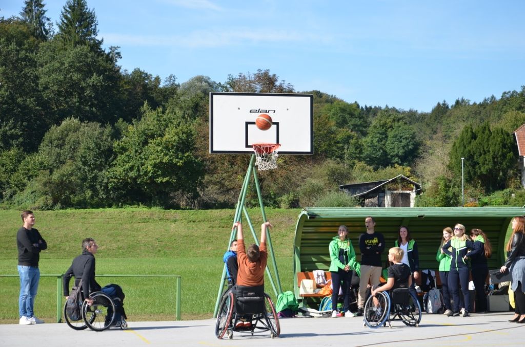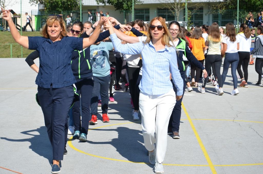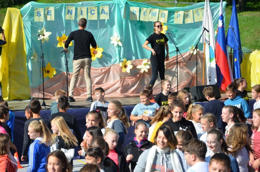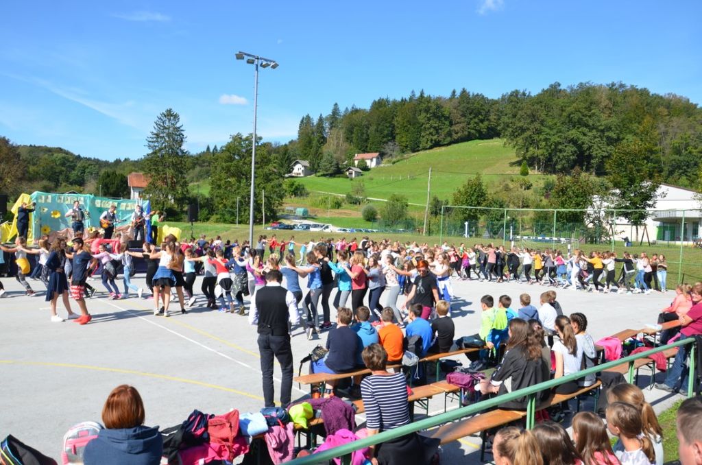 Z avtobusom smo se izpred šole odpravili do Tržišča, od tam pa smo jo peš mahnili do šole v Krmelju. Ko smo prispeli, se je prireditev začela. Geslo letošnjega tedna mobilnosti je bilo ˝Gremo peš˝. Najprej so nas pozdravili in nagovorili, nato tudi zaplesali za nas. Dva najmlajša sta nam deklamirala pesmico. Odigrali so nam prizore o tem, da je zdravo hoditi peš v šolo in o tem, kako pravilno nositi torbo, kako zložiti stvari vanjo ter kakšna je pravilna drža itd. Prišli so tudi starejši občani, ki vsako jutro telovadijo. Pokazali so nam nekaj vaj, da smo se razgibali tudi mi. Gosta pa sta tokrat bila člana kluba v Celju in člana slovenske reprezentance v košarki na vozičkih. Predstavila sta se nam in povedala svoji zgodbi, nato pa sta nam razložila pravila ˝njihove˝ košarke. Povabila sta dva izmed nas, da se preizkusita na v košarki na invalidskih vozičkih. Kot pričakovano je iz množice naših šolarjev pogumno stopil devetošolec Miha ter se odlično izkazal in zadel koš. Potem smo dobili priložnost, da zaplešemo pod vodstvom plesalcev iz plesnega studia Novo mesto. Na koncu so za zabavo in glasbo poskrbeli Veseli Dolenjci.