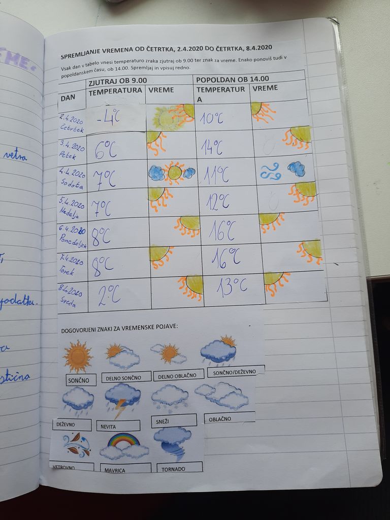 Tudi pri športni in likovni dobimo različne vaje in navodila. Naloge, ki jih moramo narediti doma pošljemo po mailu učiteljici. Pri tem mi pomagajo starši. Imeli smo tudi že športni dan, s starši smo šli na pohod in piknik. Zelo smo se zabavali. Glede ocen nas bo razredničarka verjetno ocenjevala preko video klicev. Naše znanje preverja kar vsak dan preko video klicev.