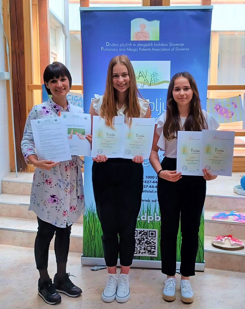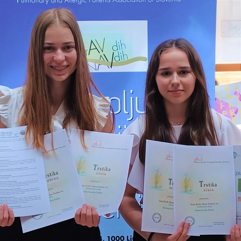 V soboto, 13. 5. 2023, so se učenci in dijaki osnovnih in srednjih šol iz celotne Slovenije udeležili zaključne prireditve 24. tekmovanja Društva pljučnih in alergijskih bolnikov Slovenije. Slavnostna podelitev je potekala v Mladinskem zdravilišču in letovišču Rdečega križa Slovenije na Debelem rtiču. Podelitve sta se udeležili tudi učenki 9. razreda OŠ Tržišče, Anja Jereb in Hana Trebše, ki sta skozi celotno šolsko leto raziskovali kajenje med učenci naše šole. Napisali sta seminarsko nalogo z naslovom Zakaj ne kadim? in izvedli intervju z diplomirano medicinsko sestro, gospo Marijo Hribar, ki je zaposlena v Domu upokojencev Sevnica. Dekleti sta s svojo raziskovalno nalogo pokazali izjemno veliko teoretičnega znanja, ki sta ga povezali s pridobljenimi rezultati izvedene ankete. Za raziskovalno nalogo jima je komisija po številu točk podelila zlato priznanje – zlato trstiko medtem ko sta za izvedeni intervju prejeli srebrno priznanje srebrna trstika.